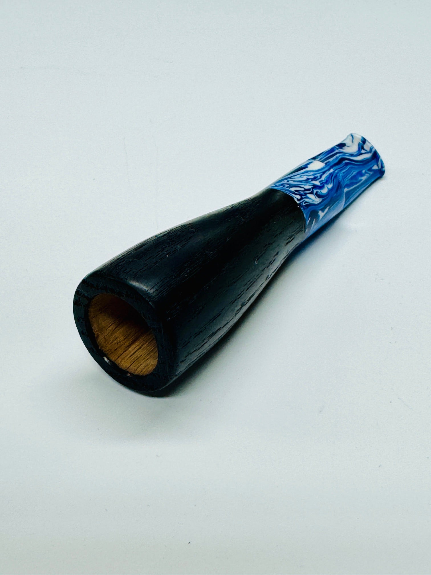 This Blue,Black and White Swirled Cigar Butt Killer has a total length of 5.0". This is a standard length model designed to compliment the contrast between the wood and the stem colors. The body is made from dyed Red Oak wood and has an acrylic stem with a beautiful blue,black and white swirl that creates a flow and texture that is really cool.