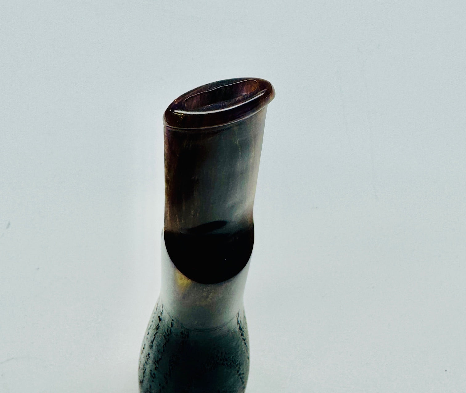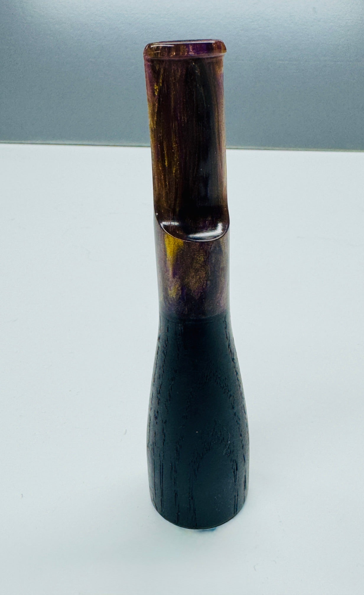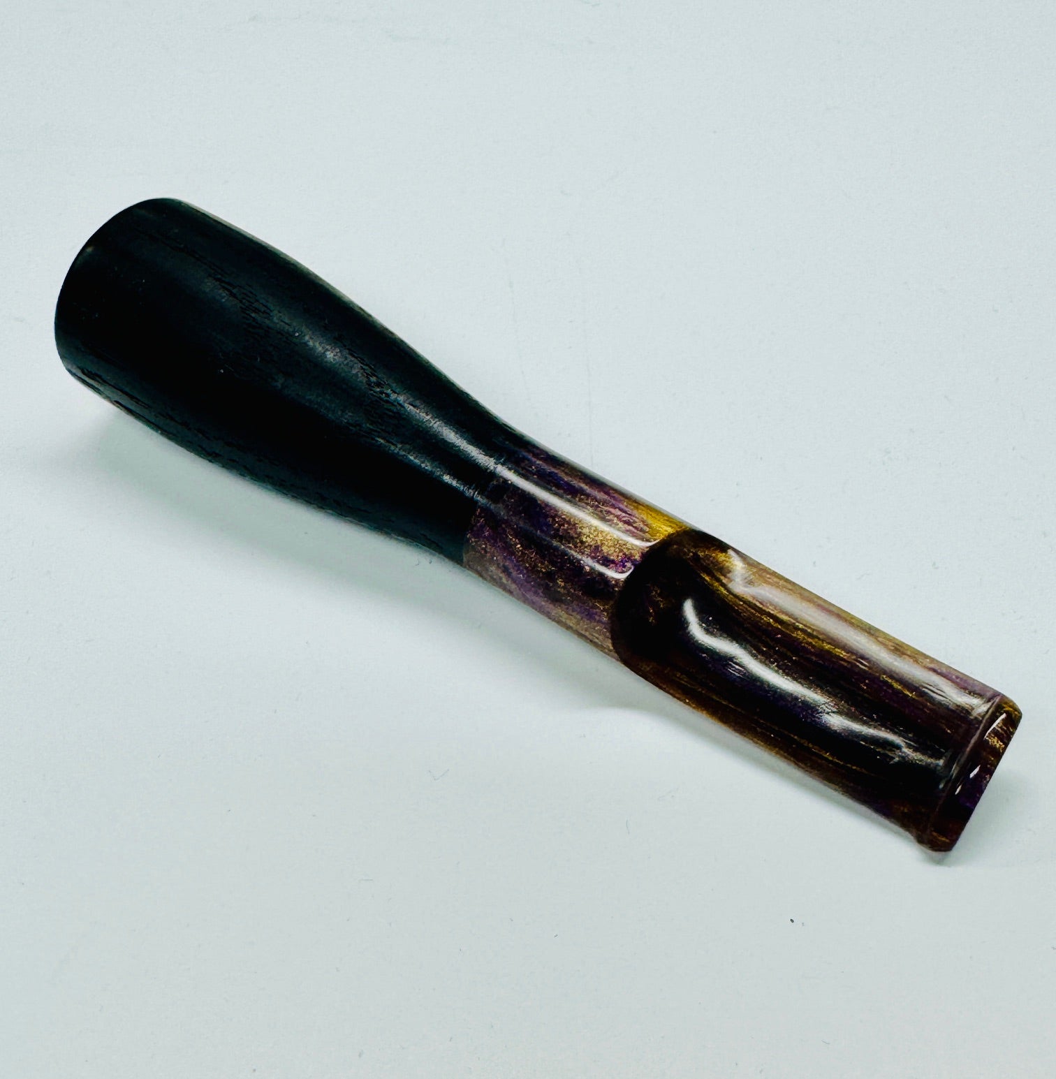 This Royal Purple Cigar Butt Killer has a total length of 5.0". This is a standard length model designed to compliment the contrast between the wood and the stem colors. The body is made from Red Oak wood that has been dyed black and has a stem with Purple and Gold swirled colors.
